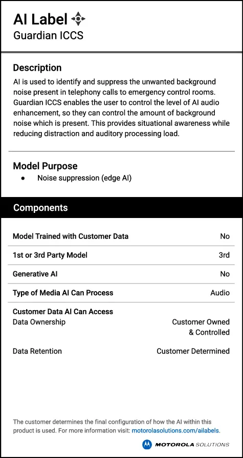Motorola Solutions AI-enabled technologies help to augment human focus, effort and performance when seconds matter. AI labels provide clear, concise descriptions of how AI is used in their products.